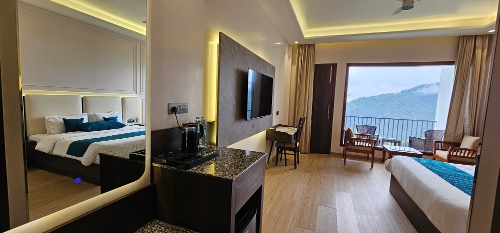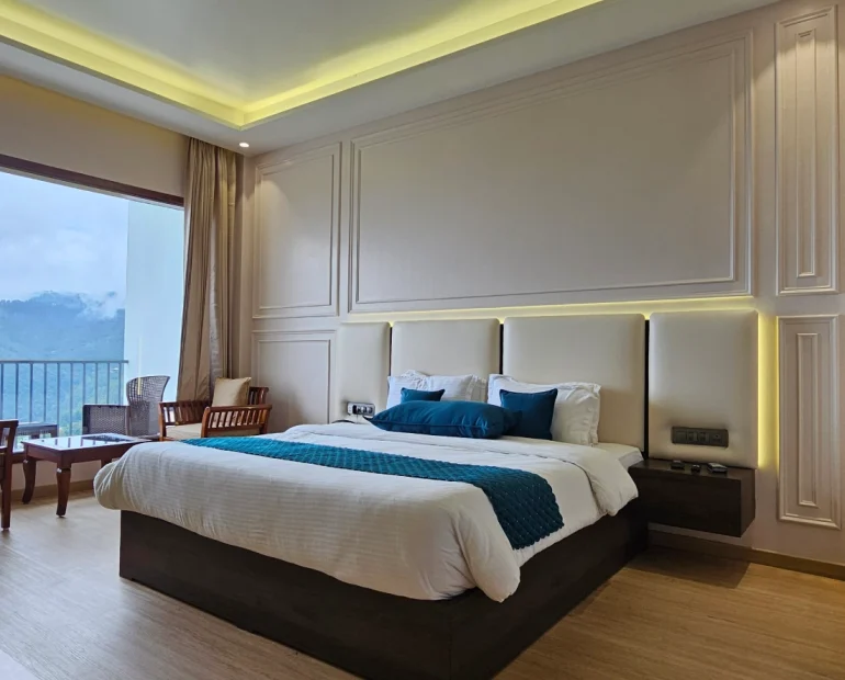 We offer Deluxe Valley View Rooms, Premium Forest Suites, Family Suites, and our signature Sky Deck Suite. Each room offers scenic views, cozy interiors, and modern amenities designed for complete comfort.